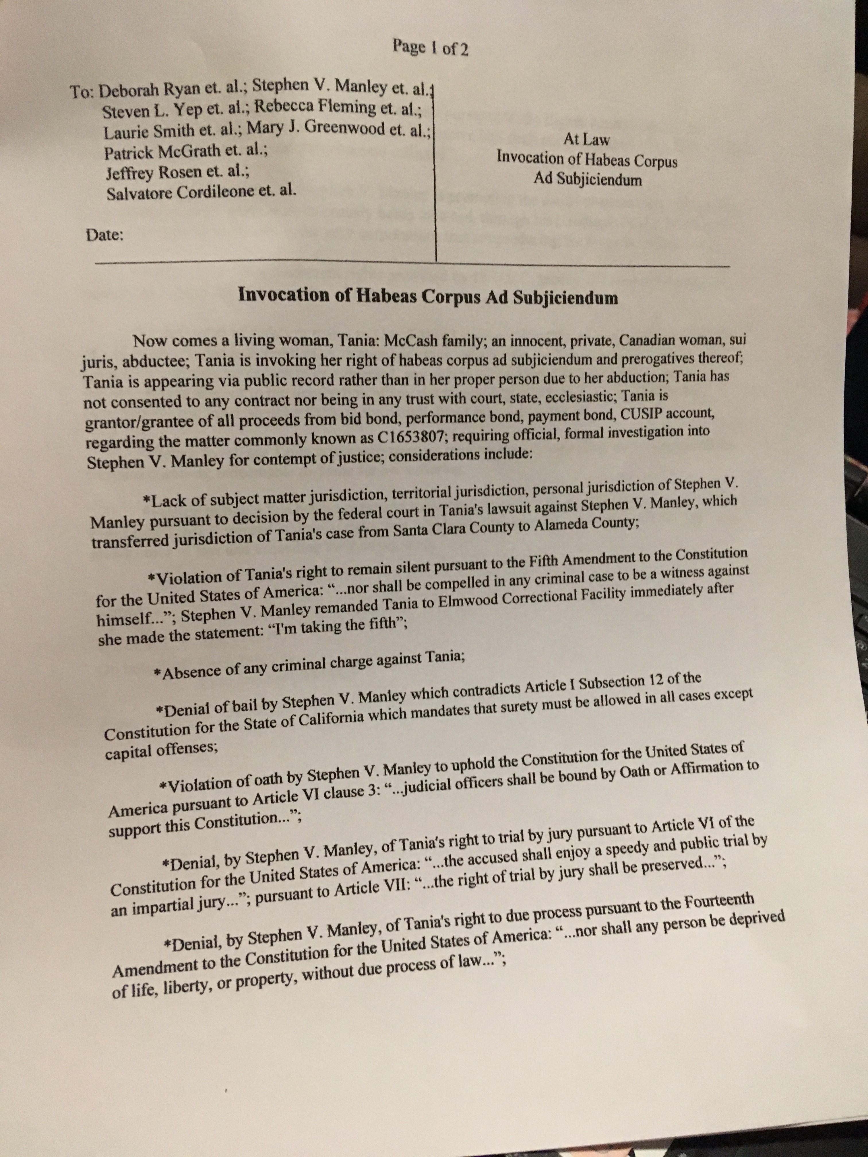 HABEAS CORPUS TO FREE TANIA MCCASH, PG 1 March 20, 2019 3024 × 4032 HABEAS CORPUS TO FREE TANIA MCCASH, PG 1 Share this:Share Click to share on X (Opens in new window) X Click to share on Facebook (Opens in new window) Facebook Like Loading...