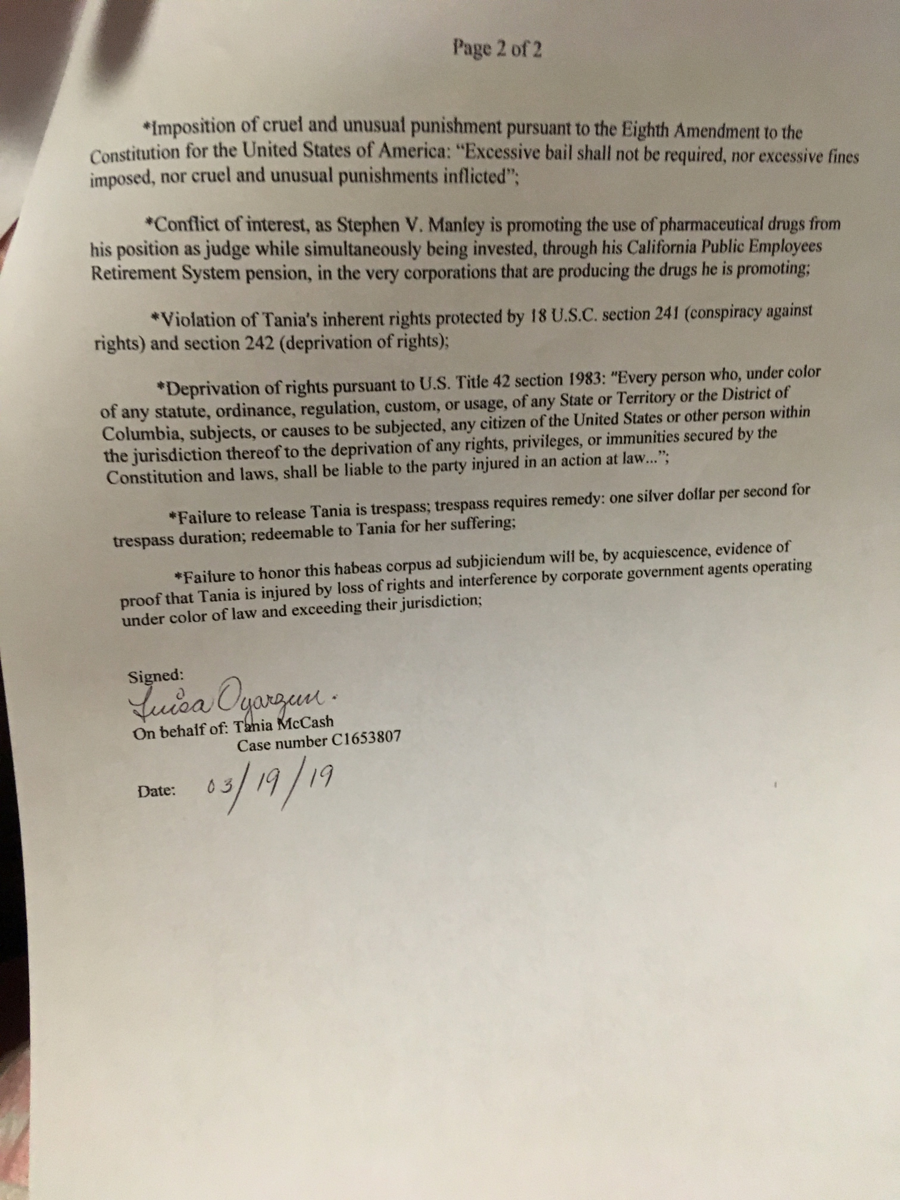 HABEAS CORPUS TO FREE TANIA MCCASH, PG 2 March 20, 2019 3024 × 4032 HABEAS CORPUS TO FREE TANIA MCCASH, PG 2 Share this:Share Click to share on X (Opens in new window) X Click to share on Facebook (Opens in new window) Facebook Like Loading...